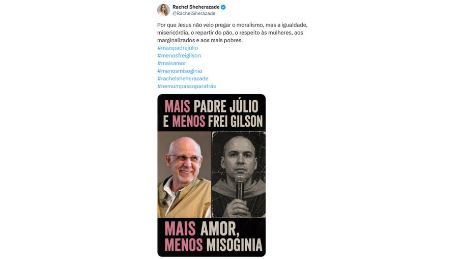 “Mais Padre Júlio e menos Frei Gilson. Porque Jesus não veio pregar o moralismo, mas a igualdade, a misericórdia, o repartir do pão, o respeito às mulheres, aos marginalizados e aos mais pobres”, escreveu Rachel.