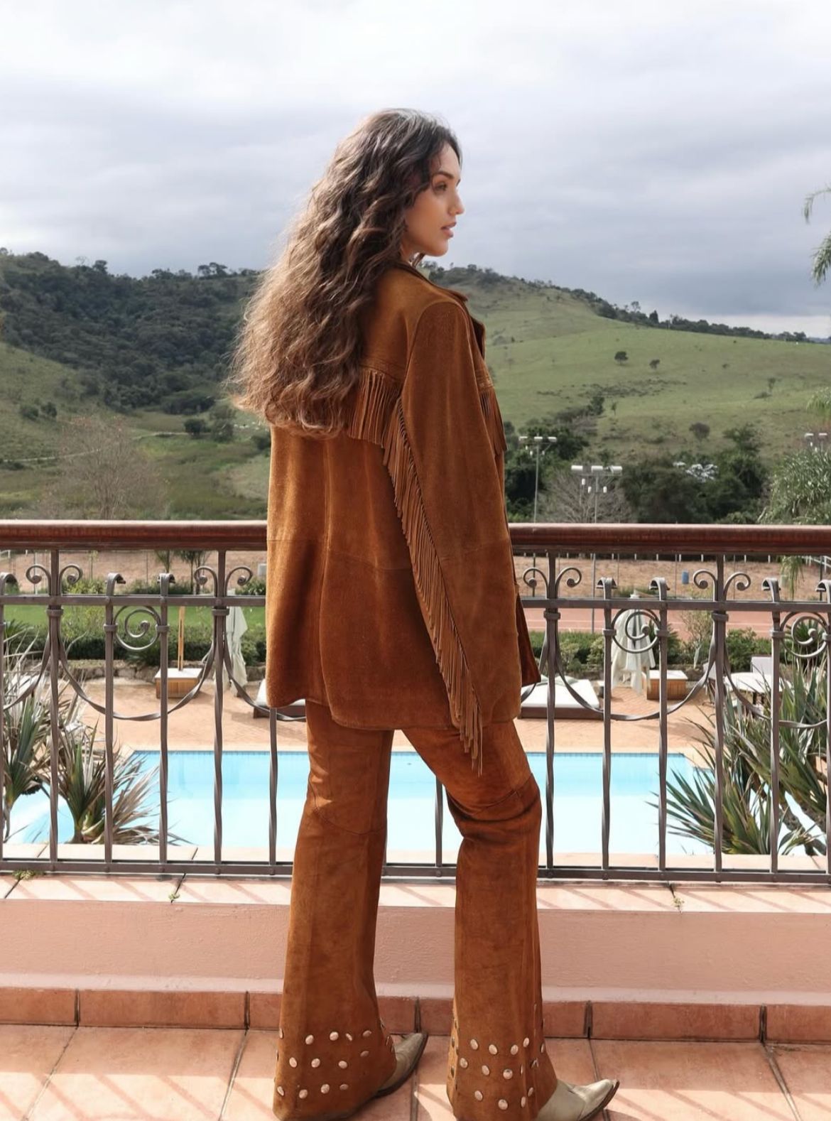Aos 32 anos, a ex-BBB e apresentadora posou usando um conjunto de camisa, top e calça de camurça, com pegada country. Na foto a mamãe do ano foi clicada com as mãos carinhosamente apoiadas sobre a barriga. “Favorite skin”, escreveu na legenda.