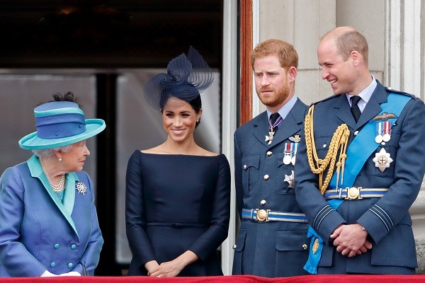 A rainha Elizabeth 2ª na companhia de Meghan Markle e dos príncipes Harry e William em evento real em julho de 2018 (Foto: Getty Images)