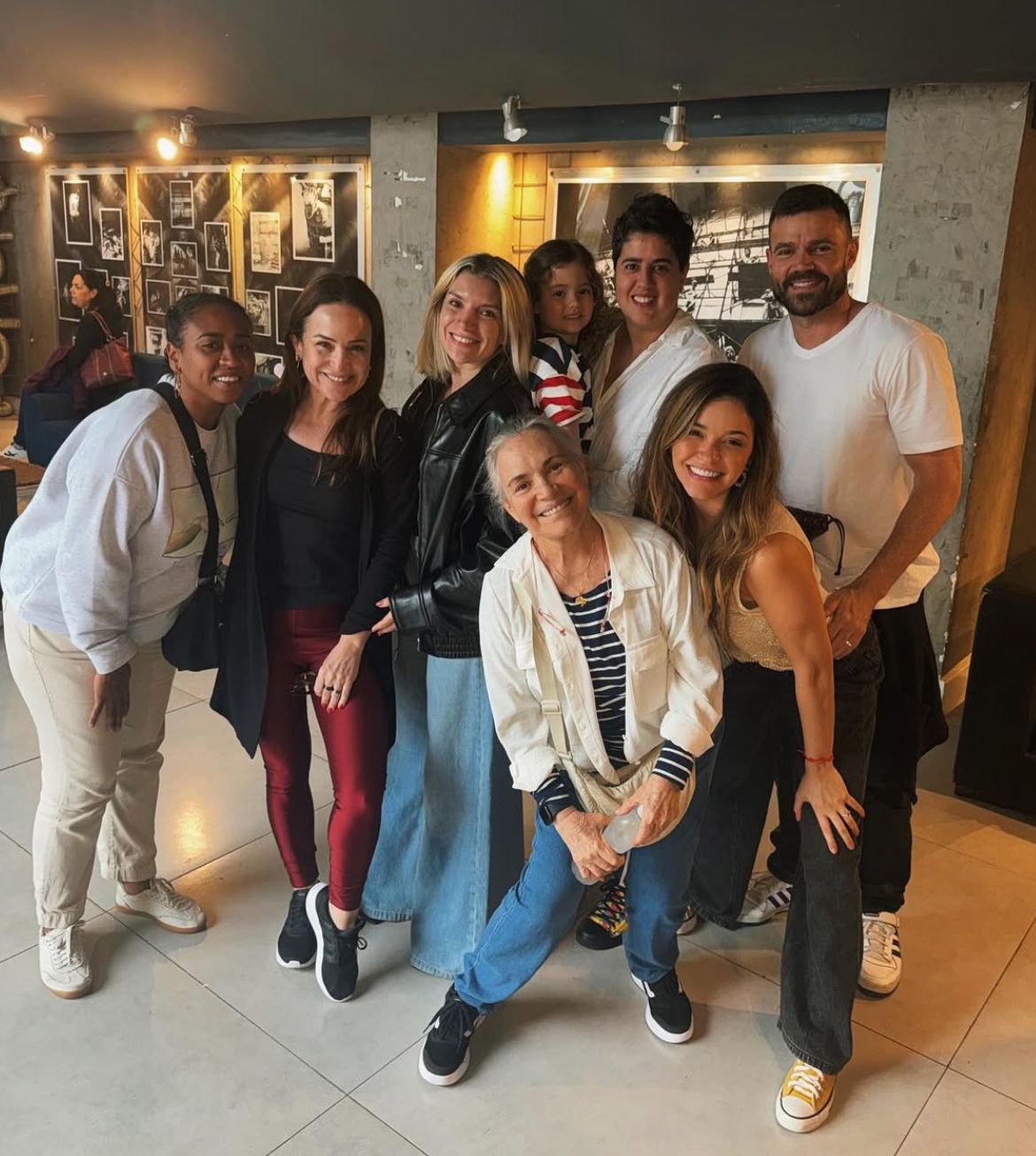 A atriz Regina Duarte, de 78 anos, surgiu sorridente em um raro clique familiar neste sábado (13) ao acompanhar um momento especial: a estreia do neto João Gabriel Alves Gomez, de 11 anos, nos palcos.