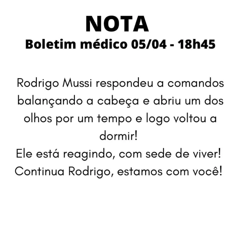 O ex-BBB Rodrigo Mussi respondeu a comandos balançando a cabeça e abriu um dos olhos por um tempo antes de voltar a dormir, informou um novo boletim médico divulgado no fim de tarde desta terça-feira (5).
