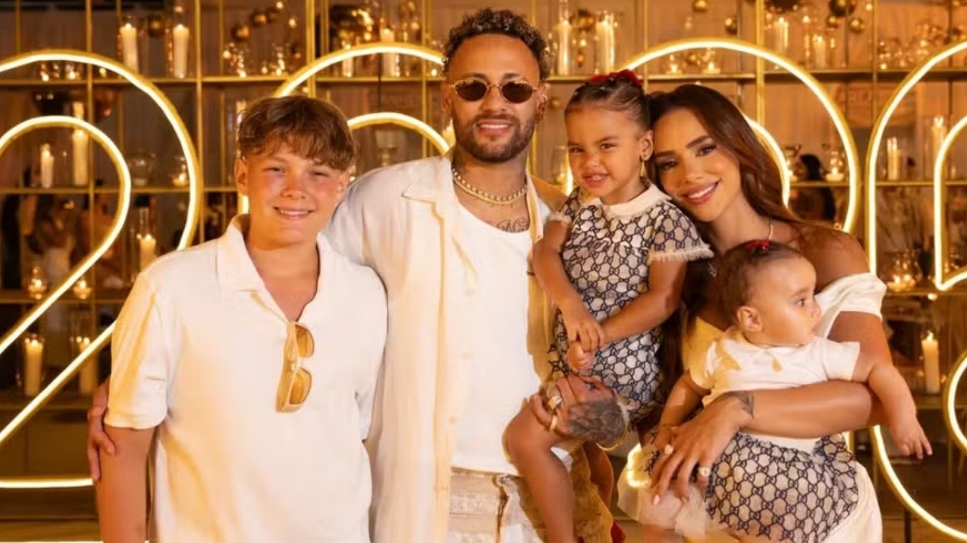 Nos cliques publicados, o atleta do Santos aparece ao lado de Bruna, das filhas do casal, Mavie, de 2 anos, e Mel, de 5 meses, além de Davi Lucca, de 14, filho do relacionamento anterior com Carol Dantas. Neymar também é pai de Helena, de 1 ano, fruto de um affair com Amanda Kimberlly, mas a menina não aparece nas imagens divulgadas, o que indica que passou a virada do ano com a mãe em outro local.