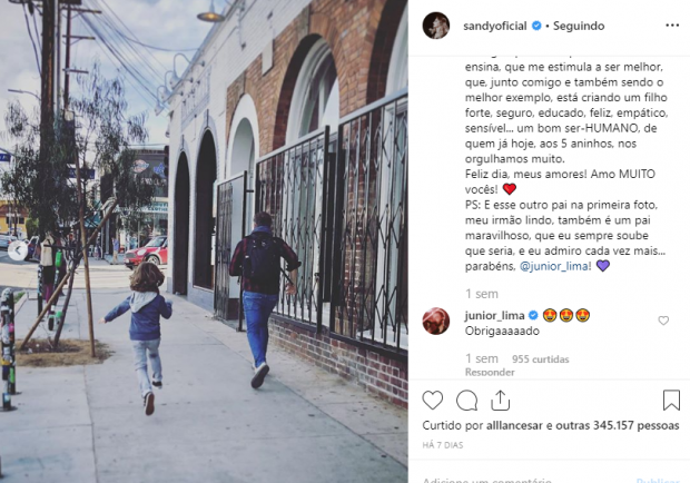 “Junto comigo e também sendo o melhor exemplo, está criando um filho forte, seguro, educado, feliz, empático, sensível… um bom ser-humano, de quem já hoje, aos 5 aninhos, nos orgulhamos muito”, completou Sandy.