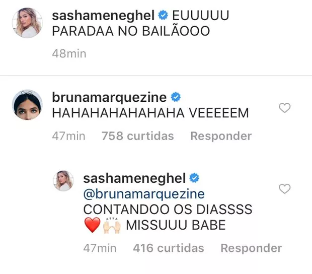 Nos comentários, Bruna Marquezine deu a entender que logo mais sua amiga estará no Brasil para curtir o Carnaval. "VEM", escreveu a atriz, que recebeu como resposta um "CONTANDO OS DIAS" de Sasha, que mora nos Estados Unidos para fazer faculdade.