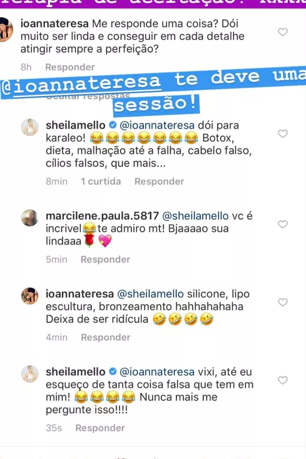 "Dói para 'karaleo'! Botox, dieta, malhação até a falha, cabelo falso, cílios falsos, que mais...", respondeu Sheila. "Vixi. Até eu esqueço o tanto de coisa falsa que tem em mim. Nunca mais me pergunte isso", brincou.