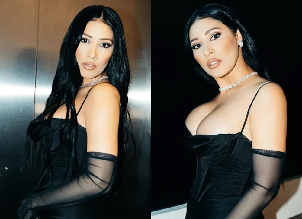 Com um vestido preto justinho e de decote avantajado, a cantora, que está com 40 anos de idade, posou para os cliques