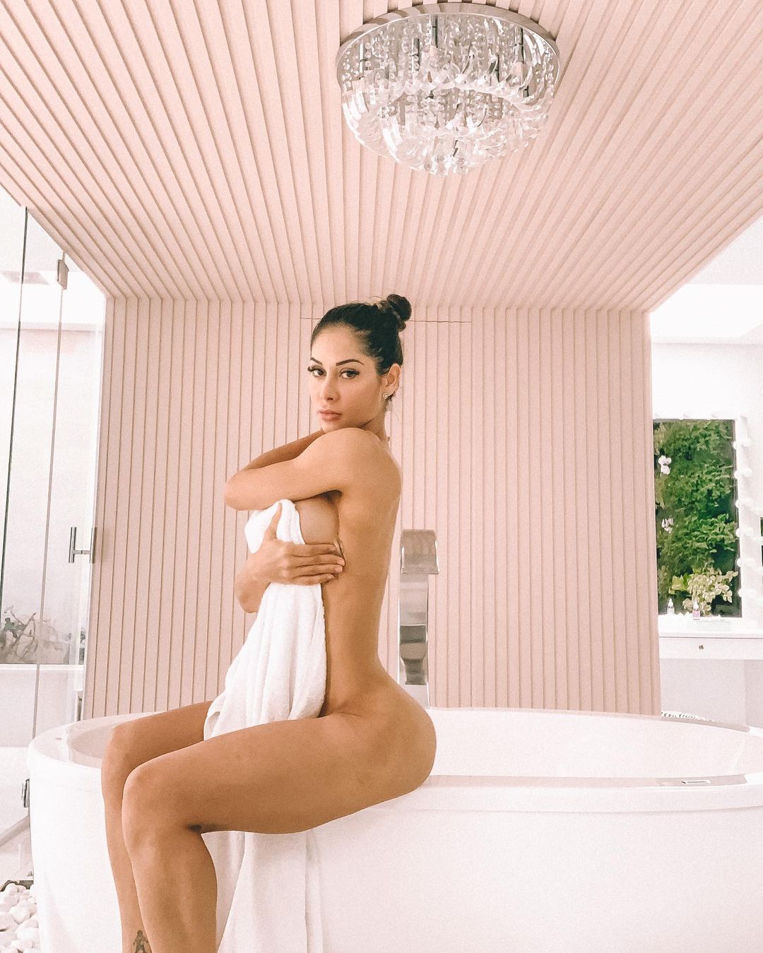 Para a hora das fotos, a influenciadora digital dispensou o uso de roupas e posou nua, tapando suas partes íntimas com uma toalha branca. Com os cabelos presos em um coque, a ex-esposa de Arthur Aguiar caprichou na hora das poses para deixar seu corpo com as curvas desenhadas.