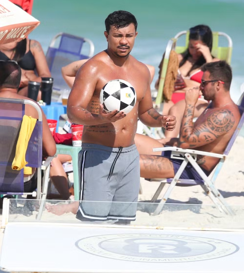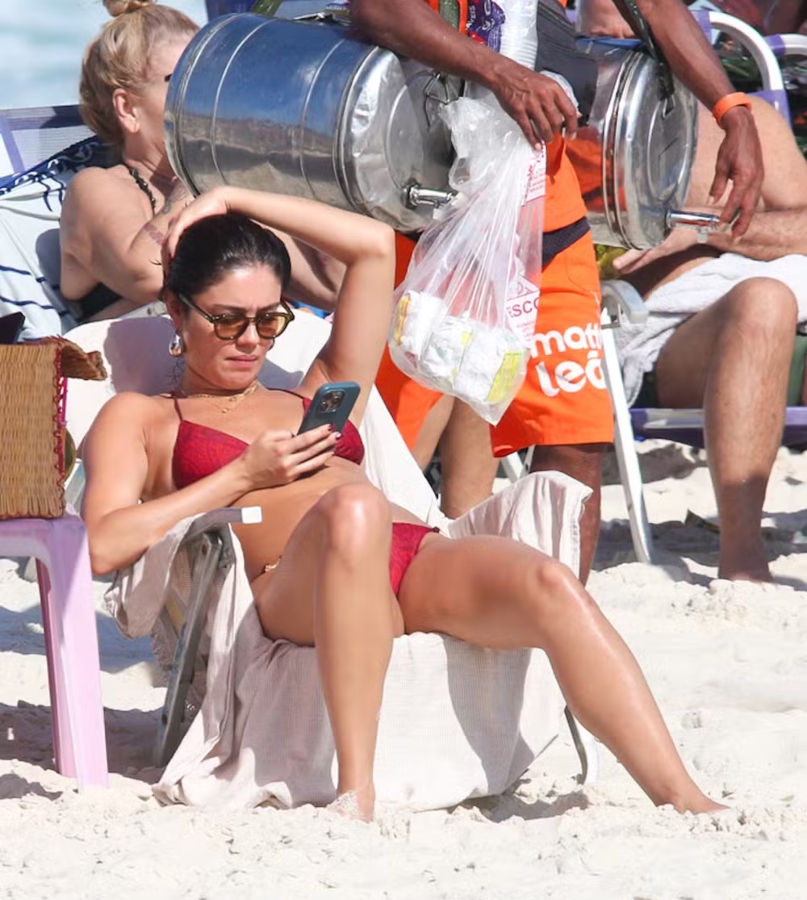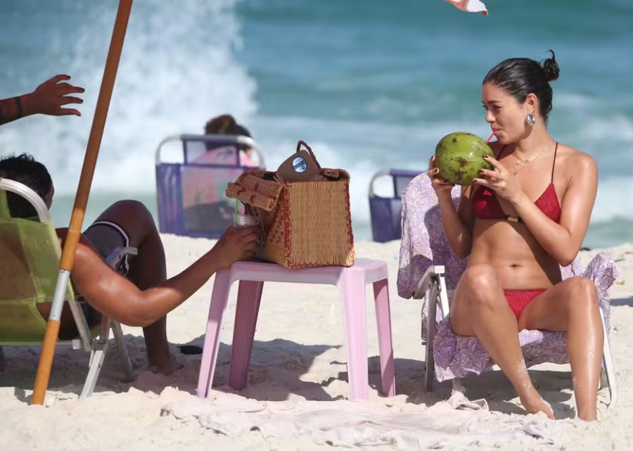 Sophie aproveitou o dia de sol para se refrescar no mar e saborear uma água de coco, usando um biquíni vermelho vibrante que combinava com o clima quente do Rio. Xamã também entrou no ritmo da praia e se divertiu jogando futmesa com amigos na areia, em um momento descontraído sob o céu azul da capital carioca.