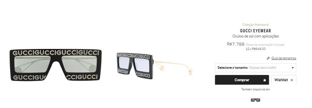 A ostentação não parou por aí. Anitta também optou por óculos escuros grifados para compor o visual. O acessório, da marca Gucci, custa nada menos do que R$ 7,7 mil, totalizando em R$ 21,6 mil.
