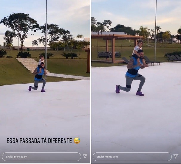 No vídeo, ele aparece com o filho Gabriel, 2 anos, nos ombros. "Olha quem tá ajudando o treino do papai hoje. O chumbinho. 20 kg de menino nas costas", brincou a modelo.