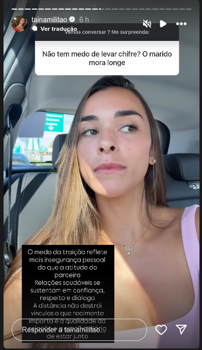 A influenciadora Tainá Castro, 29, usou suas redes sociais nesta quinta-feira (25) para responder a dúvidas de seguidores sobre seu relacionamento com Éder Militão, 27. Ela foi questionada se teme ser traída por ver o marido apenas cinco dias por mês, já que ele mora na Espanha e ela segue no Brasil com os filhos do antigo casamento.