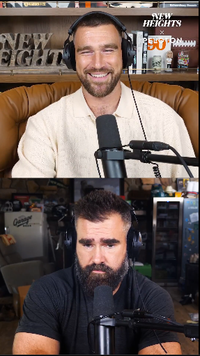 Jason Kelce abaixo e o jogador de futebol americano Travis Kelce acima, conversam em episódio de podcast. Foto: Reprodução/X(Antigo Twitter)
