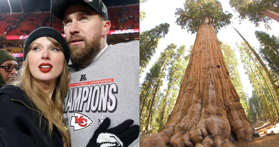 O casal Taylor Swift e Travis Kelce e a direita uma Sequoia que normalmente tem 50 a 85 metros de altura. Foto: Reprodução/GettyImages/Unipampa