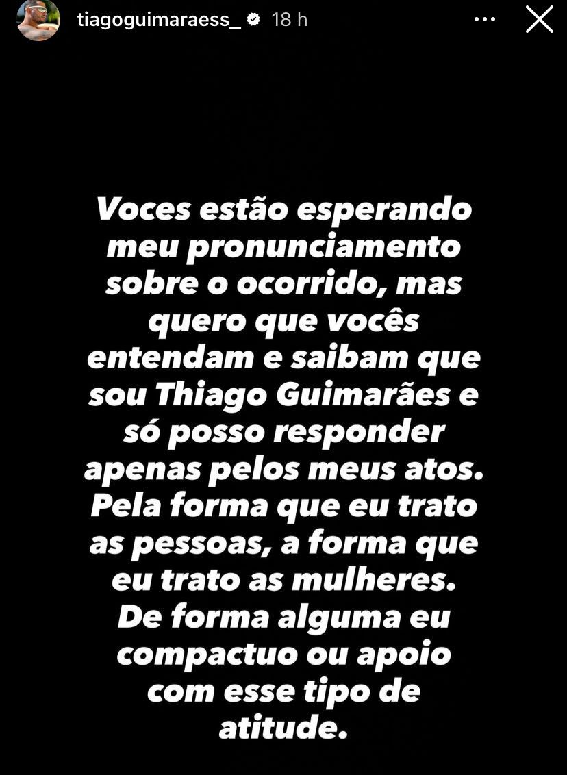 "Vocês estão esperando meu pronunciamento sobre o ocorrido, mas quero que vocês saibam que sou Thiago Guimarães e só posso responder pelos meus atos. Pela forma que eu trato as pessoas, a forma que eu trato as mulheres, De forma alguma eu compactuo ou apoio esse tipo de atitude’’, escreveu nos Stories do Instagram.