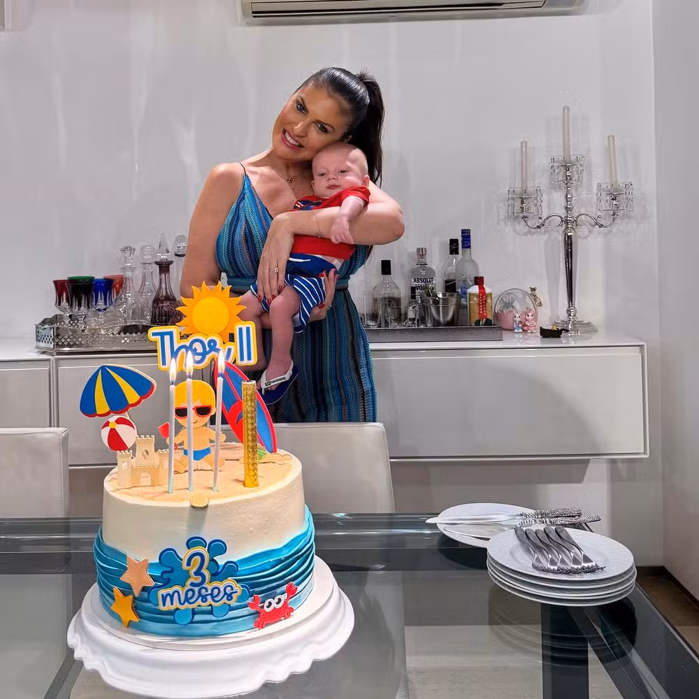 🏖️ TEMA PRAIA: O ''mêsversário'' teve bolo personalizado que trazia decoração do neto de Eike Batista e Luma de Oliveira brincando na areia.