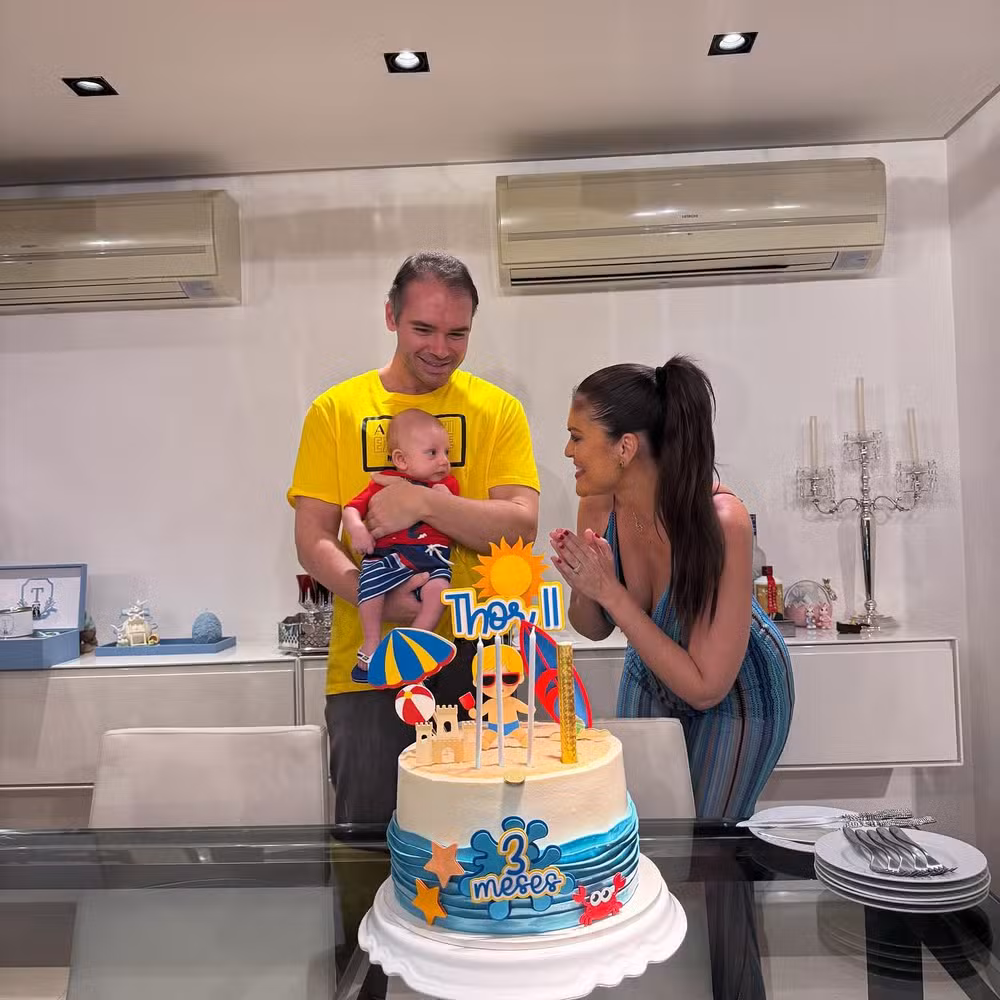 O empresário Thor Batista e sua esposa, a modelo e empresária Lunara Campos, realizaram nesta terça-feira (23) uma festinha para comemorar os 3 meses do filho do casal, Thor II.