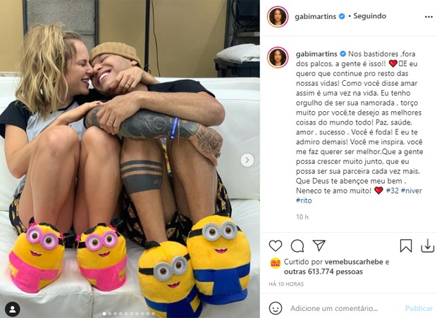 Mais cedo, Gabi prestou uma homenagem ao namorado na web, com uma série de fotos. "Nos bastidores ,fora dos palcos, a gente é isso!! E eu quero que continue pro resto das nossas vidas! Como você disse amar assim é uma vez na vida. Eu tenho orgulho de ser sua namorada, torço muito por você, te desejo as melhores coisas do mundo todo!", começou ela.