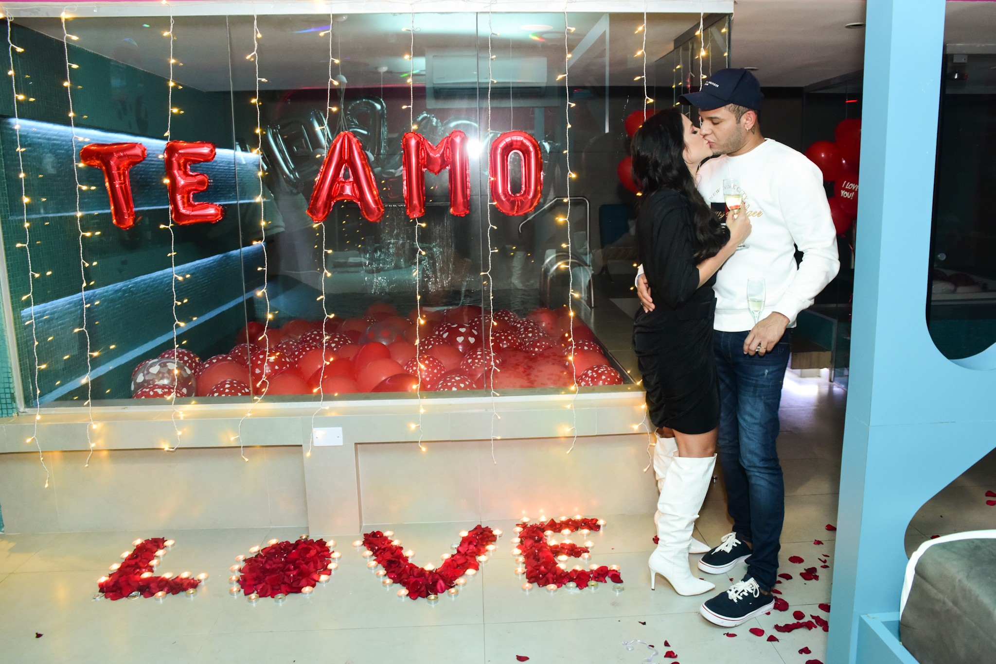 No maior romance, com direito a balões, pétalas de rosa e tudo o mais, o casal trocou beijos no local para celebrar a data com uma noite romântica a dois.