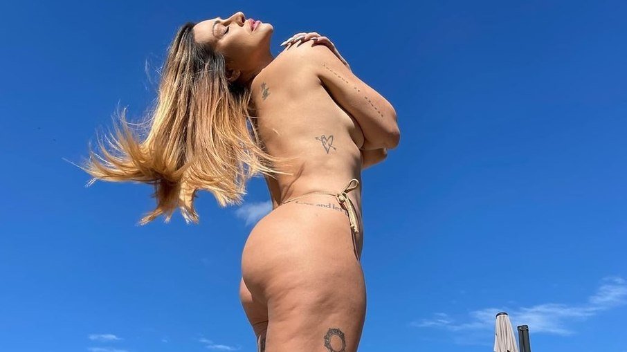 Cleo compartilhou neste sábado (21) uma foto em que aparece renovando o bronzeado usando apenas a parte de baixo do biquini e cobrindo os seios com os braços. Na legenda, a atriz escreveu: “Bota a cara no sol”.