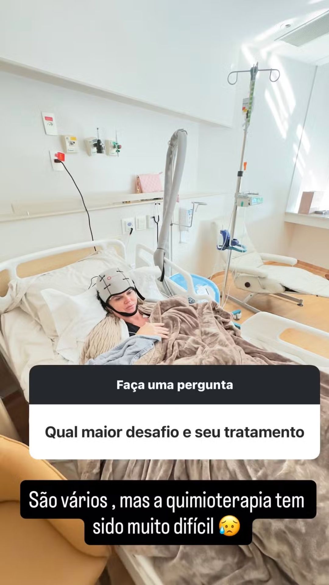 Questionada sobre o maior desafio após o diagnóstico de câncer, a influenciadora revelou: "São vários, mas a quimioterapia tem sido muito difícil". Além disso ela também falou que só terá uma alta permanente após 10 anos sendo acompanhada. Porém, no momento ela está focada em finalizar esse primeiro tratamento.