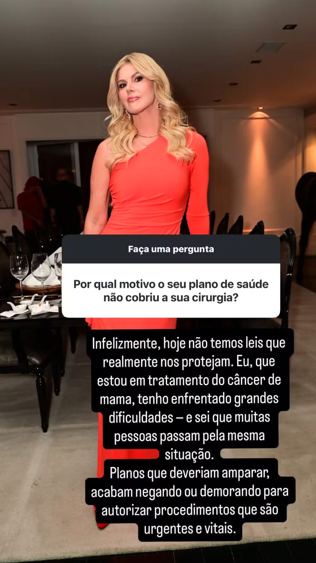 Na manhã desta terça-feira (4), Val Marchiori, 51 anos, respondeu dúvidas dos seus seguidores sobre seu tratamento contra o câncer de mama. Uma delas questionou o porquê do plano de saúde da socialite, conhecida por sua participação no reality show Mulheres Ricas, não cobriu o valor integral da operação dela.