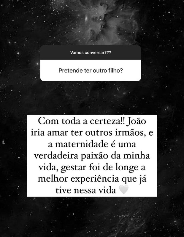 “Pretende ter outro filho?“, perguntou. “Com toda a certeza! João iria amar ter outros irmãos, e maternidade é uma verdadeira paixão da minha vida. Gestar foi de longe a melhor experiência que já tive nessa vida”, respondeu ela.