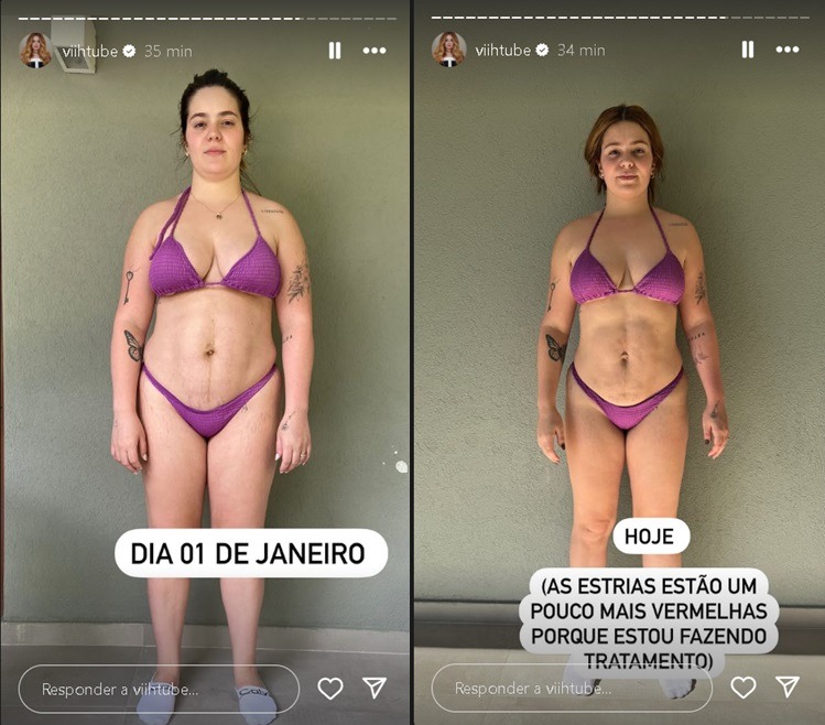 Ao participar de uma trend em uma rede social, ela exibiu seu “glow up”, mostrando registros antigos, ainda acima do peso, e uma foto atual, bem mais magra, sorridente e com o corpo transformado. “O quanto essas fotos te afetaram?… O suficiente”, escreveu na legenda.