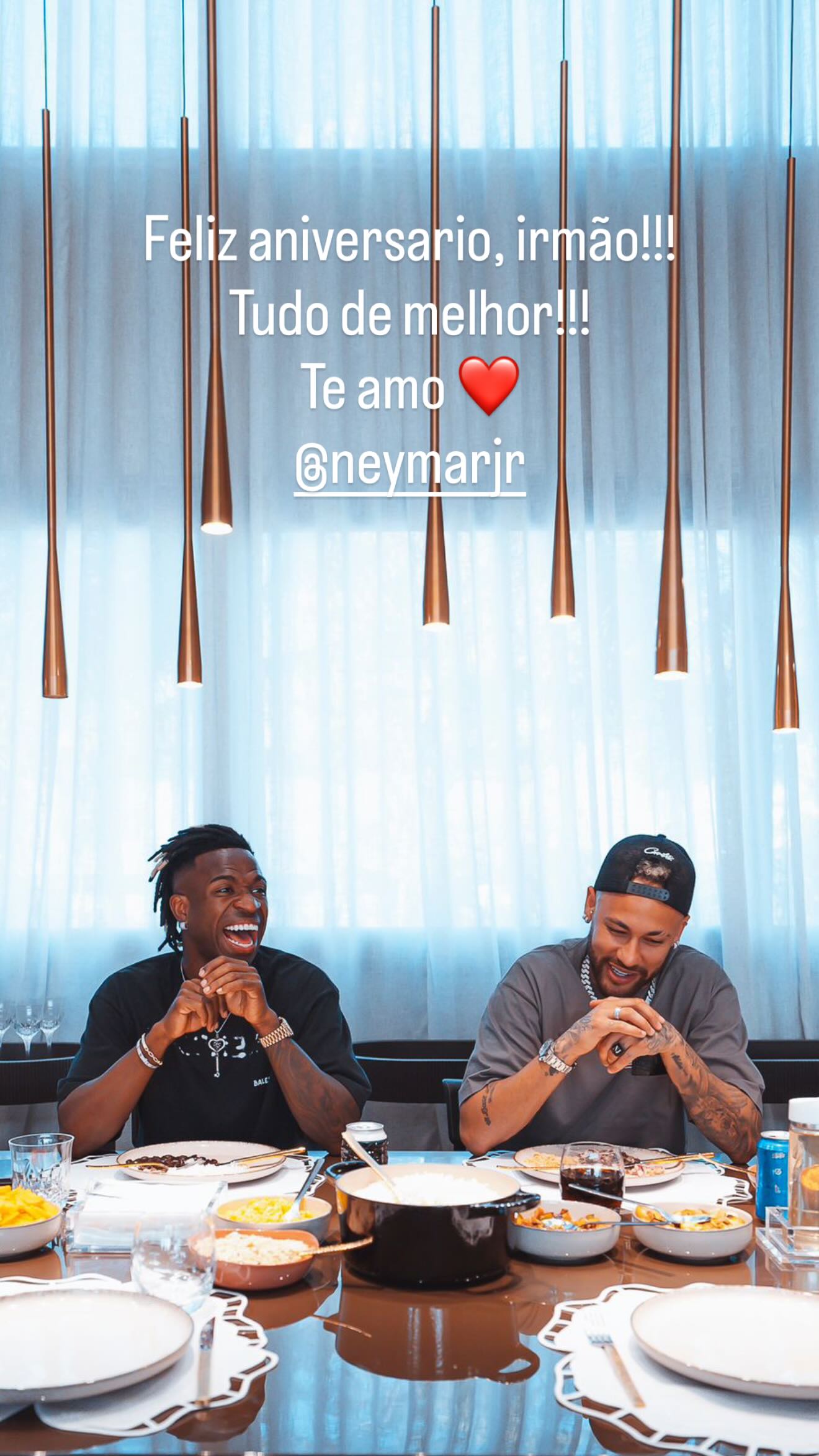 O jogador do Real Madrid, Vini Jr, usou as redes sociais nesta quinta-feira (5) para celebrar o aniversário de 34 anos do atacante do Santos, Neymar. Em uma mensagem afetuosa, Vini Jr escreveu: "Feliz aniversário, irmão. Tudo de melhor. Te amo", acompanhada de uma foto em que os dois aparecem em um momento de descontração e diversão.
