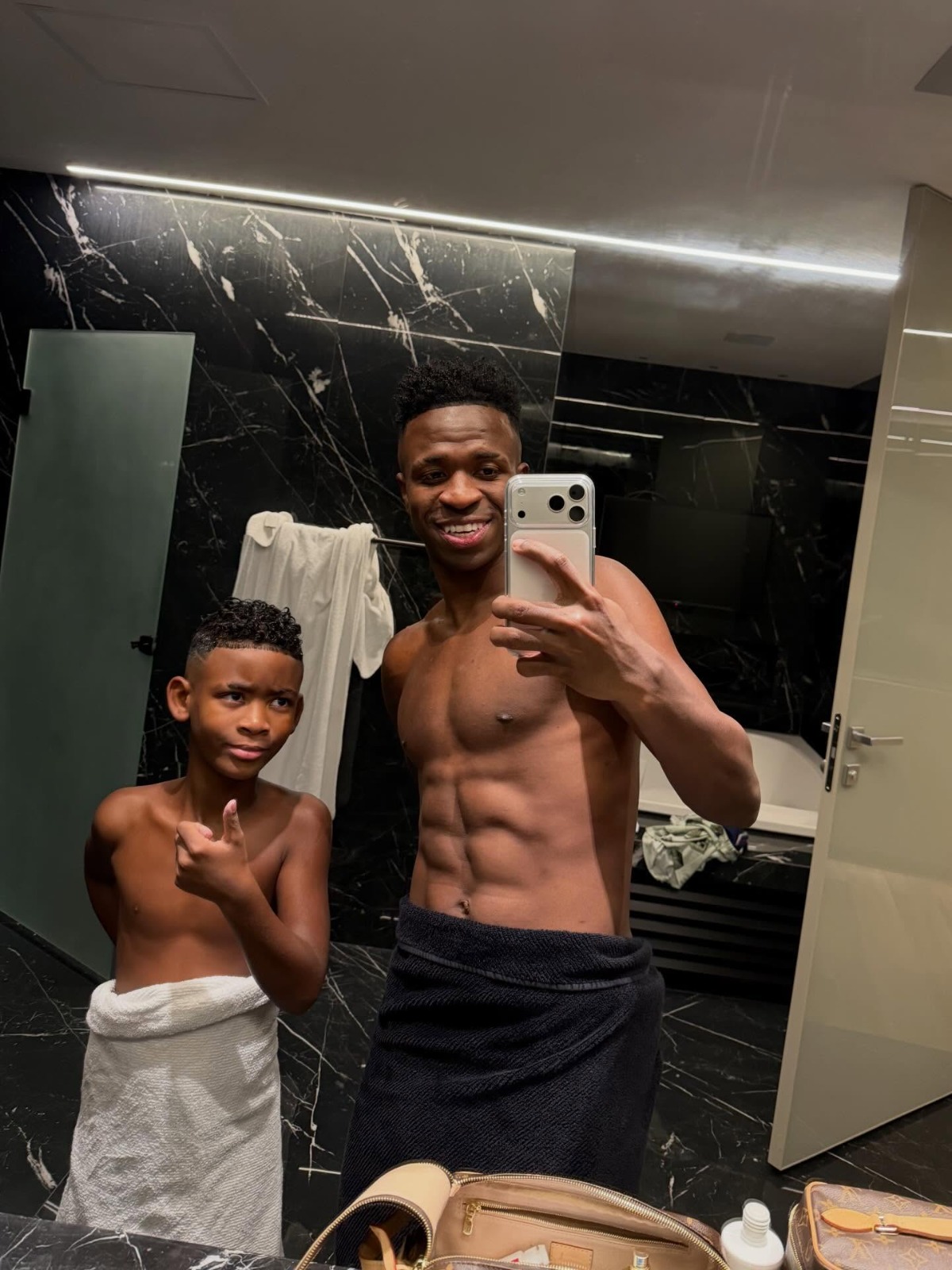 Nos registros, Vini Jr. também chamou atenção ao exibir o tanquinho em uma foto ao lado do irmão caçula, Bernardo, de 10 anos. Além dele, o jogador é irmão de José das Neves Oliveira Neto, o Netinho, de 18. Os dois são filhos de Fernanda Cristina e Vinicius José Paixão de Oliveira.