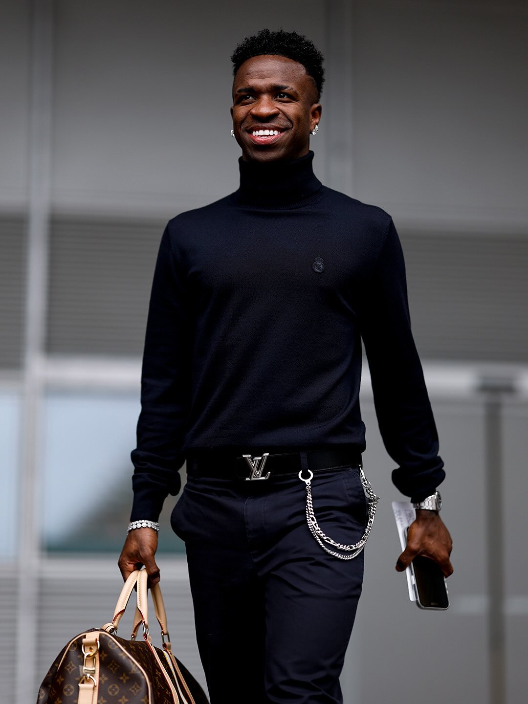 O atacante do Real Madrid exibiu peças da Louis Vuitton e um cinto da grife que custa cerca de R$ 5.550, enquanto a mala, também assinada pela maison francesa, é avaliada em aproximadamente R$ 18.200. O grande destaque do look, no entanto, ficou por conta do relógio.
