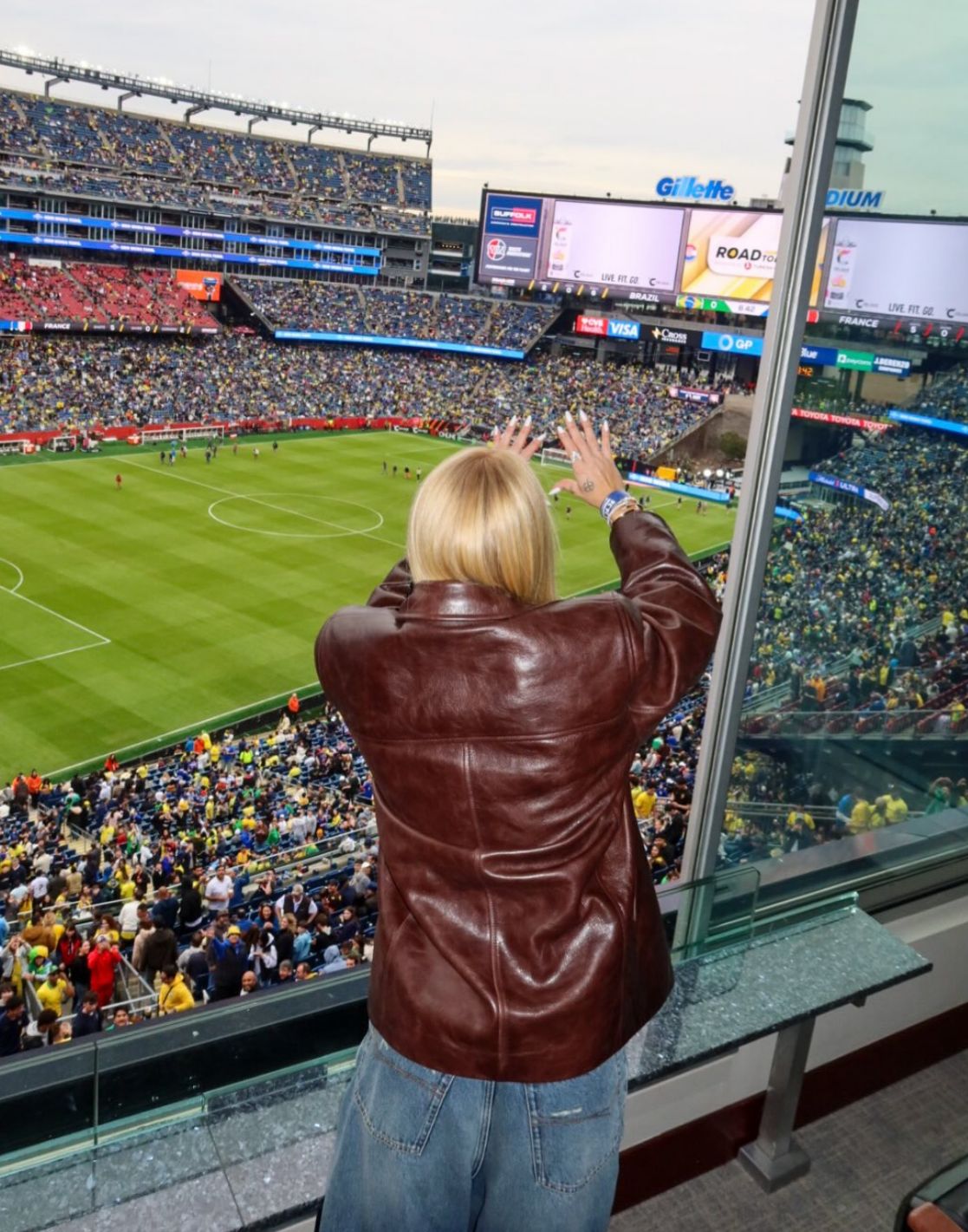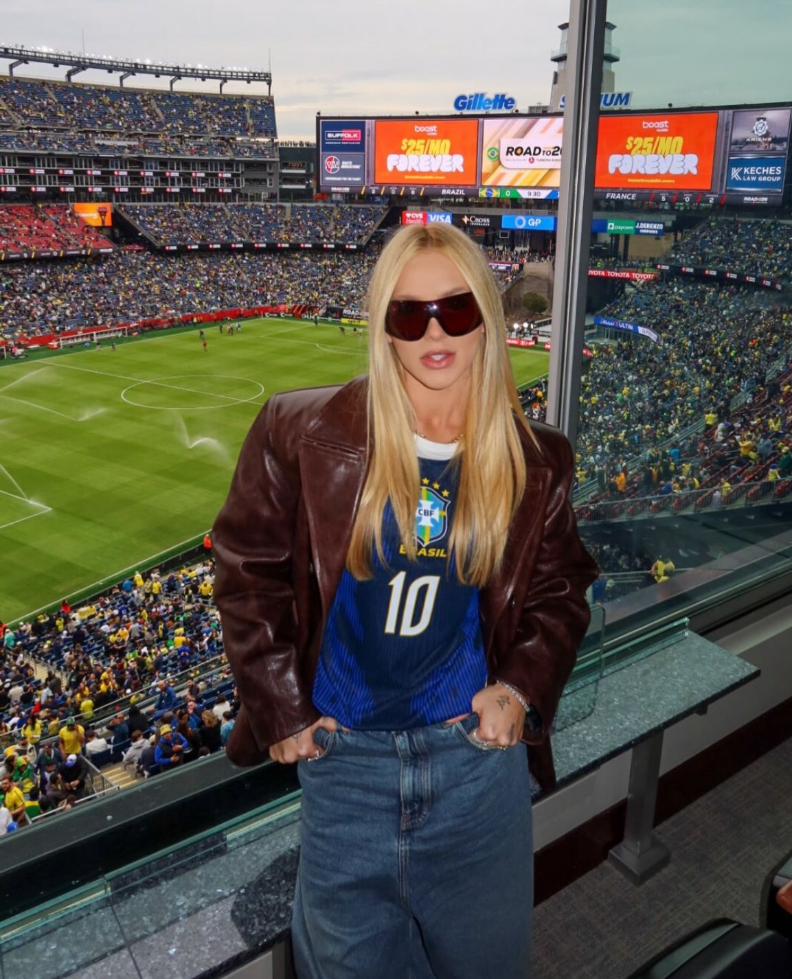 Nos registros publicados, Virginia aparece vestindo a camisa azul da seleção, com o nome de Vini Jr., jaqueta de couro e óculos escuros. Na legenda, ela escreveu “Vamo”, acompanhada de emojis da bandeira do Brasil.