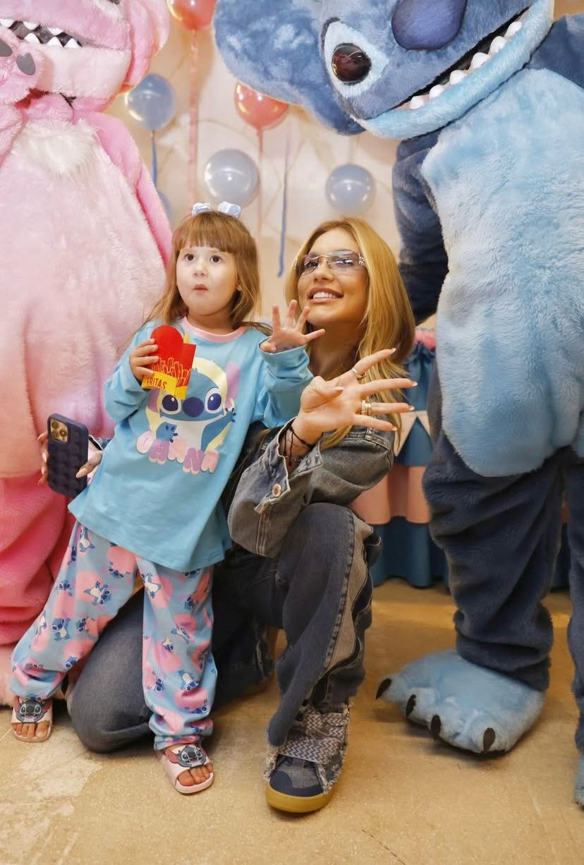 A comemoração contou com uma festa temática de “Lilo & Stitch” em uma sala de cinema, com a presença de familiares e amigos. A decoração foi inspirada no filme da Disney e incluiu a participação de uma pessoa caracterizada como o personagem Stitch.