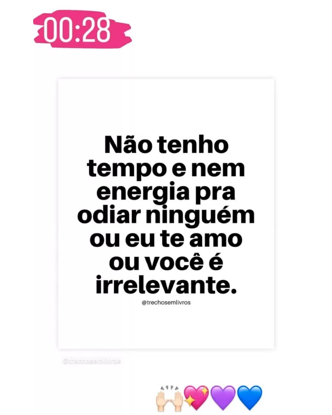 "Não tenho tempo e nem energia pra odiar ninguém. Ou eu te amo, ou você é irrelevante", dizia o conteúdo exibido nos stories do Instagram.