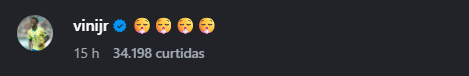 A interação do jogador do Real Madrid com o post impulsionou ainda mais o alcance da foto, que seguiu repercutindo nas redes sociais ao longo da noite.