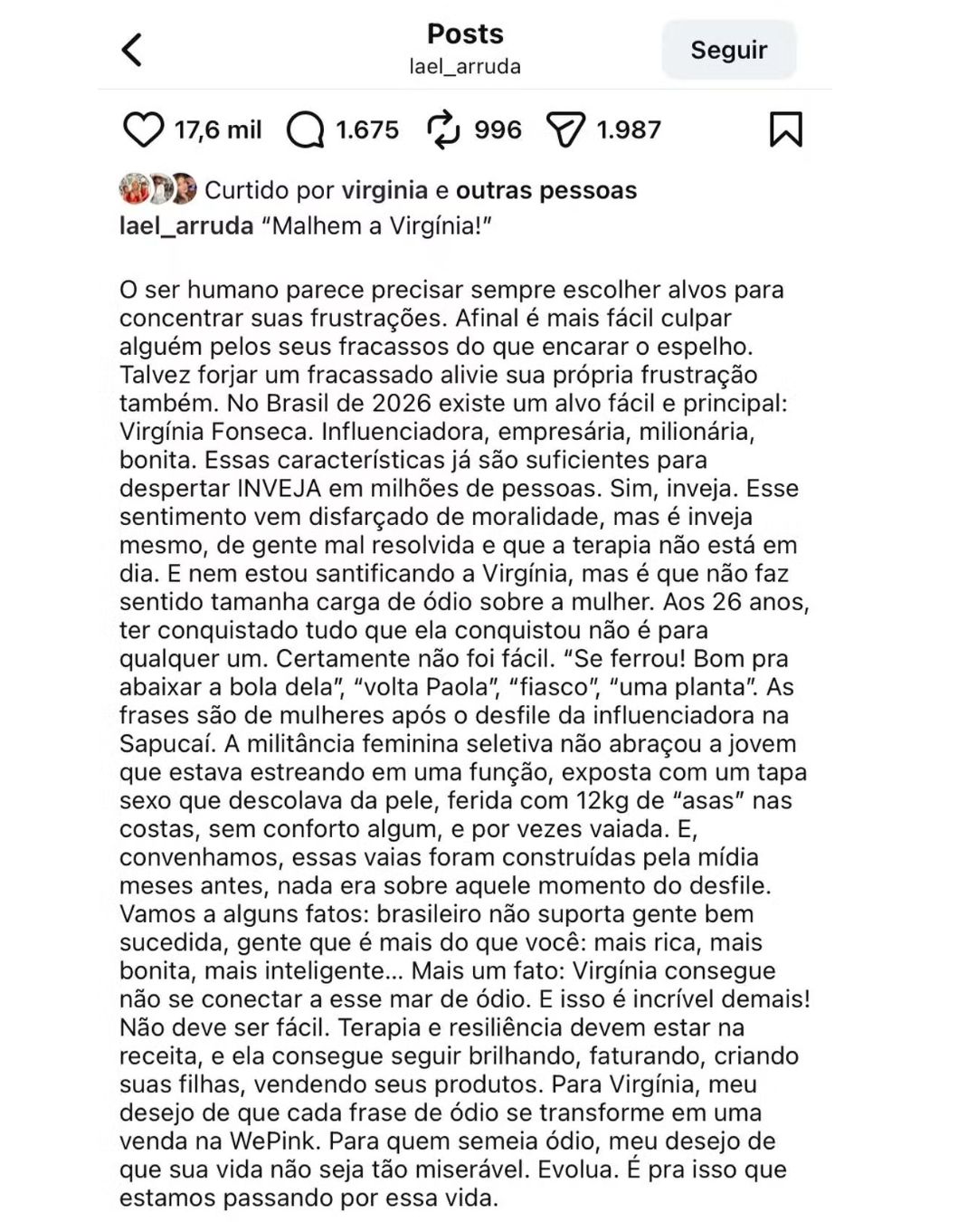 Ao concluir, o autor volta a atribuir as críticas à inveja e elogia a postura da empresária diante dos ataques. "Virginia consegue não se conectar a esse mar de ódio. E isso é incrível demais! Não deve ser fácil. Terapia e resiliência devem estar na receita, e ela consegue seguir brilhando, faturando, criando suas filhas, vendendo seus produtos", finaliza a publicação curtida por Virginia.
