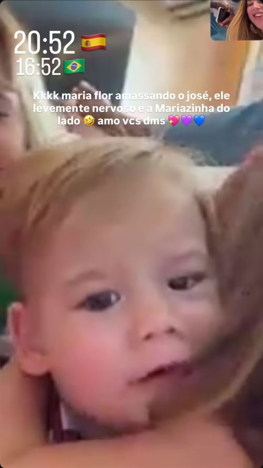 Virginia Fonseca, de 26 anos, compartilhou nas redes sociais registros de uma chamada de vídeo com os três filhos, frutos do relacionamento com Zé Felipe: Maria Alice, de 4 anos, Maria Flor, de 3, e o caçula José Leonardo, de 1 ano. Nos prints publicados pela influenciadora, Vini Jr. também aparece participando da conversa com as crianças.