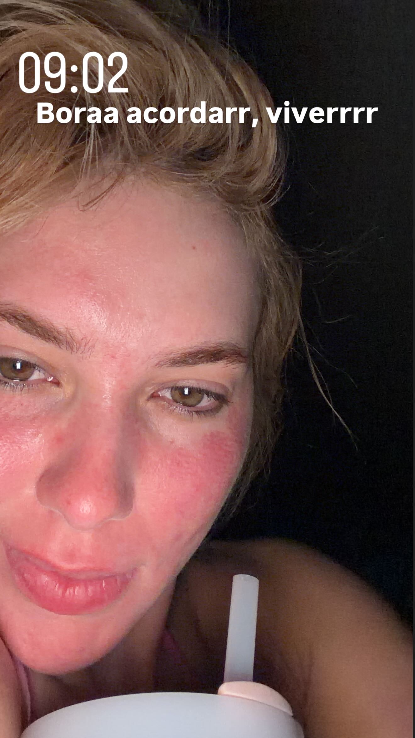 A empresária então mostrou o rosto completamente avermelhado. "Vermelha, não, além. Bora acordar, viver", afirmou.