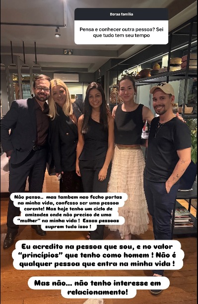 Quando questionado sobre a possibilidade de conhecer outra pessoa, Lucas respondeu: "Não penso, mas também não fecho portas na minha vida. Confesso ser uma pessoa carente! Mas hoje tenho um ciclo de amizades onde não preciso de uma 'mulher' na minha vida. Essas pessoas suprem tudo isso".