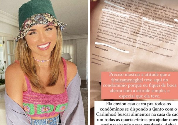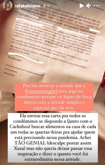 Rafa contou que Xuxa enviou essa carta pra todos os condôminos se dispondo a junto com o Carlinhos, funcionário dele, buscar alimentos na casa de cada um todas as quartas-feiras pra ajudar quem está precisando nessa pandemia. A apresentadora e influenccer conta ainda que achou tão genial a idéia e pediu desculpas a Xuxa, por postar a carta.