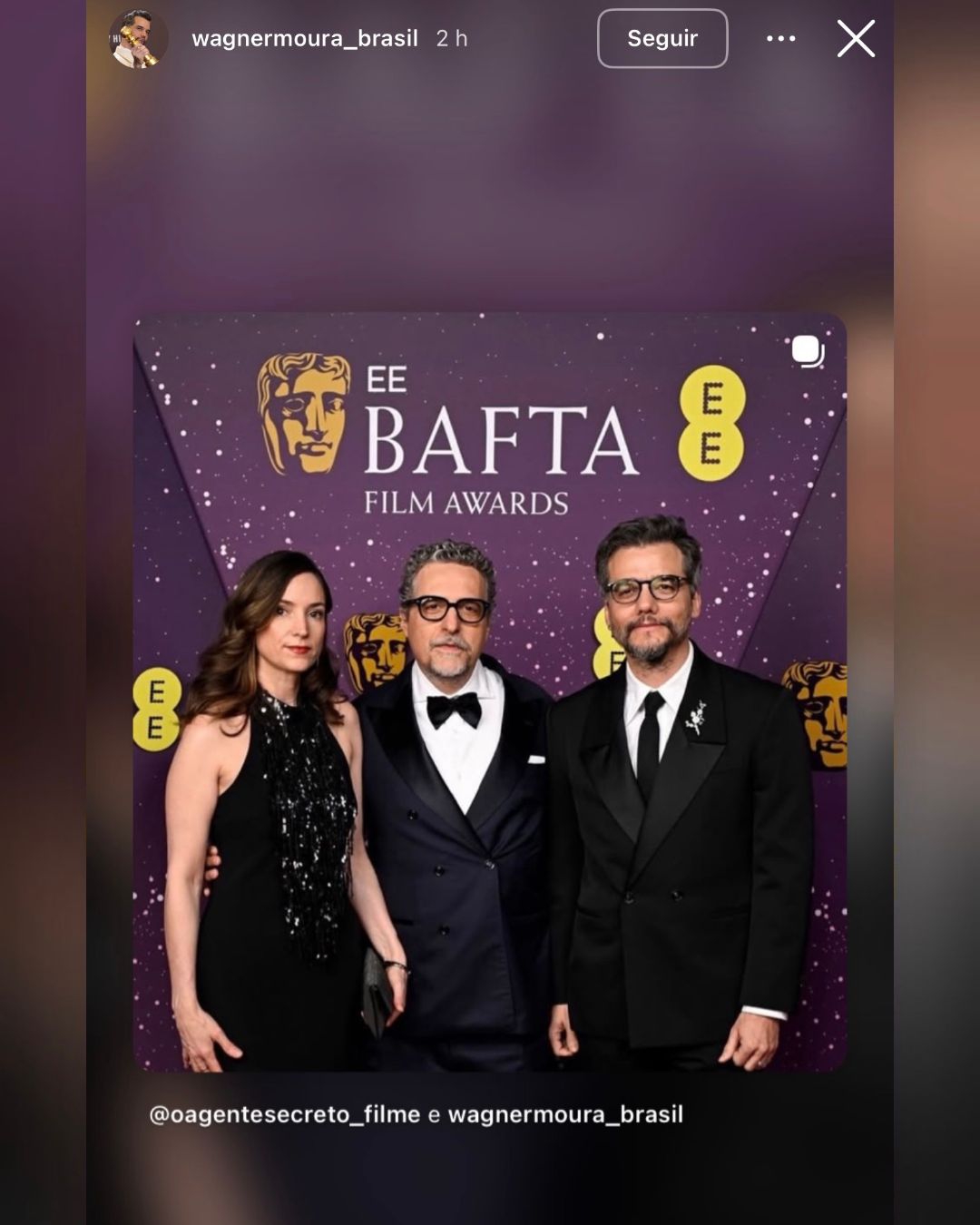 Wagner Moura, de 49 anos, cruzou o tapete vermelho do Bafta neste domingo (22), em Londres, na premiação organizada pela British Academy of Film and Television Arts. O ator chegou ao Royal Festival Hall acompanhado de Emilie Lesclaux e Kleber Mendonça Filho para prestigiar o longa brasileiro que concorre a duas categorias, reforçando a força do cinema nacional na temporada de premiações.