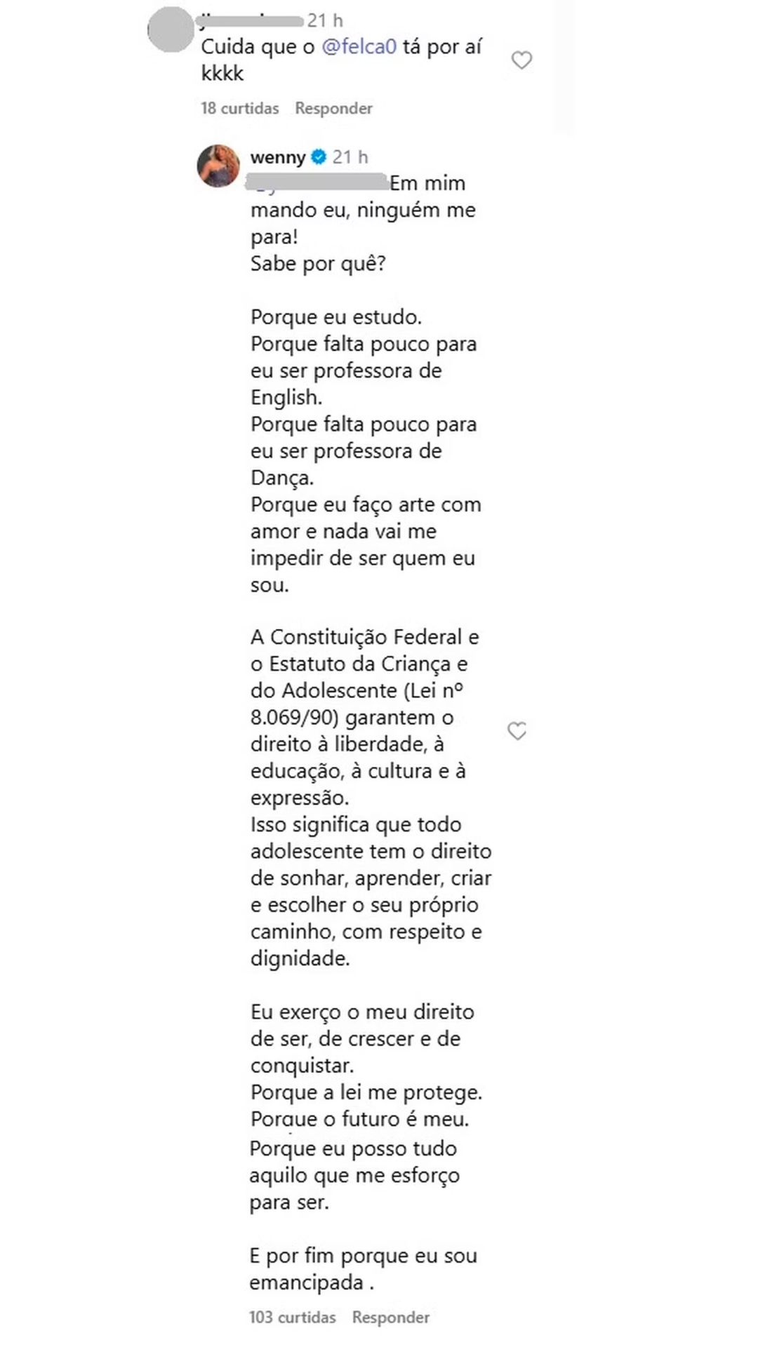 Em resposta, Wenny publicou um longo texto defendendo sua autonomia e trajetória artística. “Em mim mando eu, ninguém me para! Sabe por quê? Porque eu estudo. Porque falta pouco para eu ser professora de English. Porque falta pouco para eu ser professora de Dança. Porque eu faço arte com amor e nada vai me impedir de ser quem eu sou”, escreveu a jovem cantora.