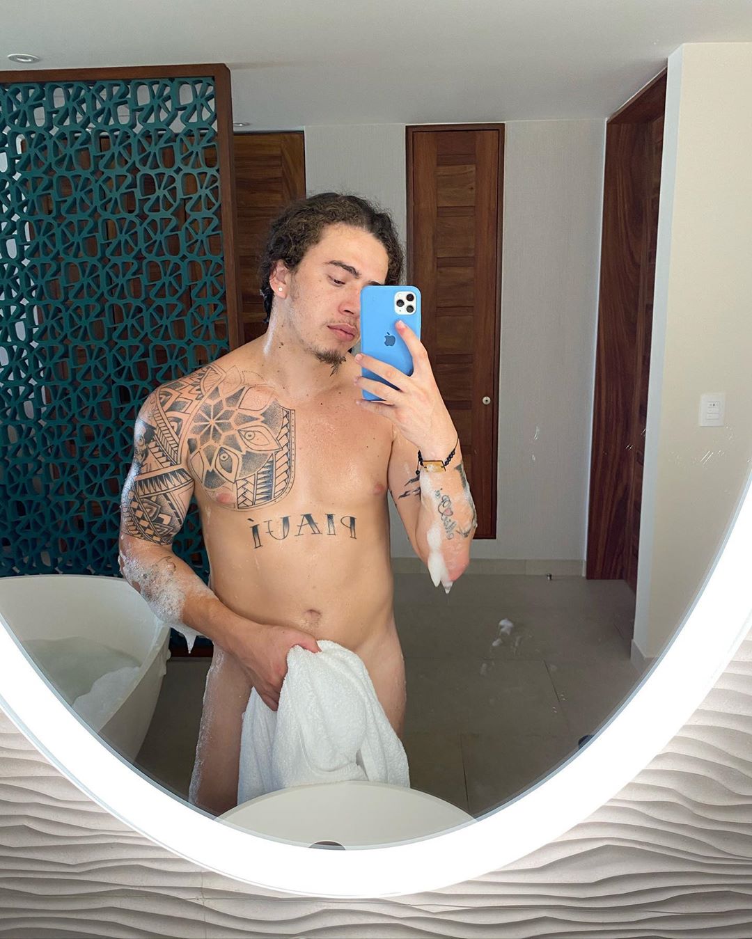 De férias no México, Whindersson Nunes posou bem à vontade em frente ao espelho do hotel em que está hospedado. O humorista compartilhou neste sábado uma sequência de cliques em que aparece cobrindo suas partes íntimas com uma toalha de banho, enquanto ainda tem espumas no corpo após um banho na banheira, que também aparece nas fotos.