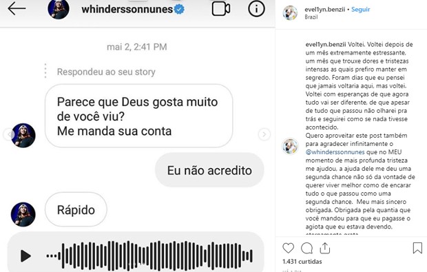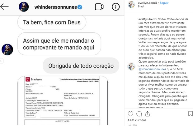 "Quero aproveitar este post também para agradecer infinitamente o @whinderssonnunes que no meu momento de mais profunda tristeza me ajudou, a ajuda dele me deu uma segunda chance não só da vontade de querer viver melhor como de encarar tudo o que passou como uma segunda chance. Meu mais sincero obrigado. Obrigada pela quantia que você mandou para que eu pagasse o agiota que eu estava devendo, eternamente grata", finalizou ela. Que fofo, né?!