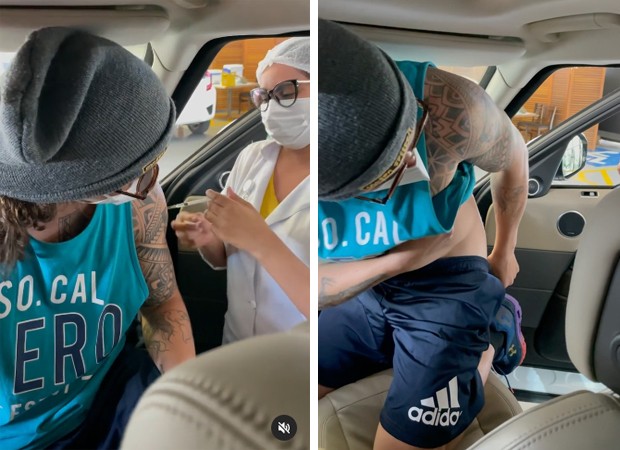 "Me confundi de tanta felicidaaaaaadeeee!! Pensei q era no popô!", disse ele, que no começo das imagens aparece abaixando a bermuda e mostrando um pedaço do bumbum para a profissional de saúde que aplicou o medicamento. "Não esqueça a segunda dose!!", avisou.