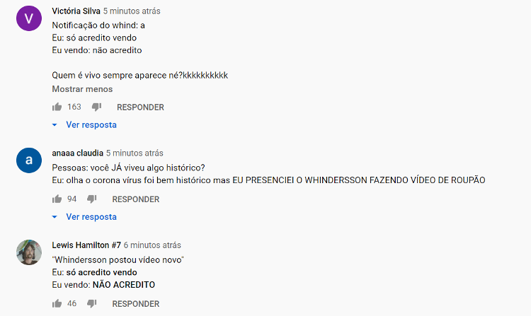 O humorista continuou: "Vocês acham que todo avião é o mesmo avião que vai pra Europa, do Neymar, do Cristiano Ronaldo? Não é, gente. Tem a Ferrari dos avião e tem o Celta. O meu é o Celta." Sem contar as lives durante a pandemia e publicidades, esse é o primeiro vídeo de Whindersson desde março. Os fãs já haviam perdido as esperanças de ver novos conteúdos na plataforma.