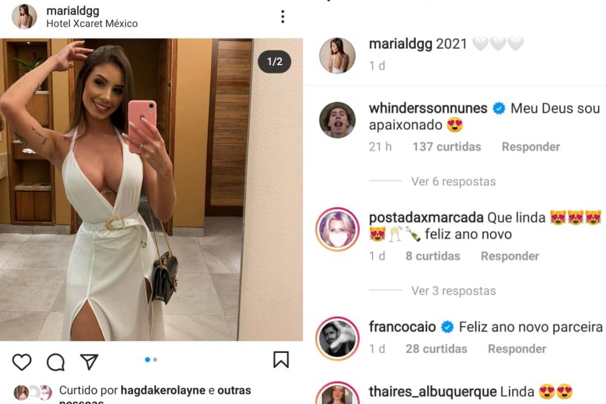 Whindersson Nunes se derreteu pela namorada, Maria Lina Degann, no Instagram nesta sexta-feira (1). A estudante de engenharia publicou uma foto exibindo o look que escolheu para a virada do ano, um vestido branco superdecotado, e o humorista fez questão de comentar. As informações são da Quem.