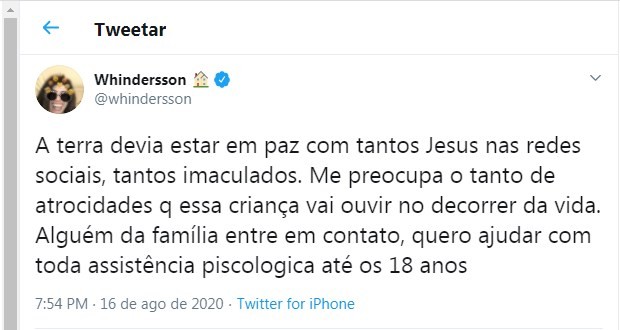 "A Terra devia estar em paz com tantos Jesus nas redes sociais, tantos imaculados. Me preocupa o tanto de atrocidades que essa criança vai ouvir no decorrer da vida. Alguém da família entre em contato, quero ajudar com toda assistência piscologica até os 18 anos", informou ele.
