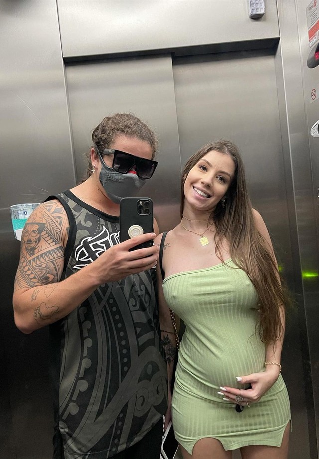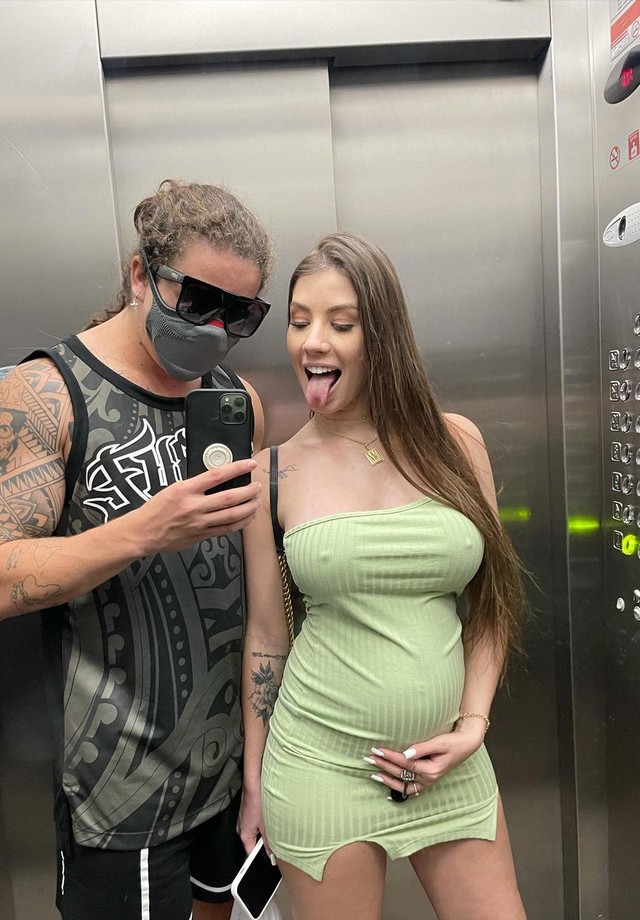 Grávida do primeiro filho do casal, a estudante posou com o noivo no elevador e seguidor chamou atenção pra um detalhe de seu corpo: “Desnecessário”