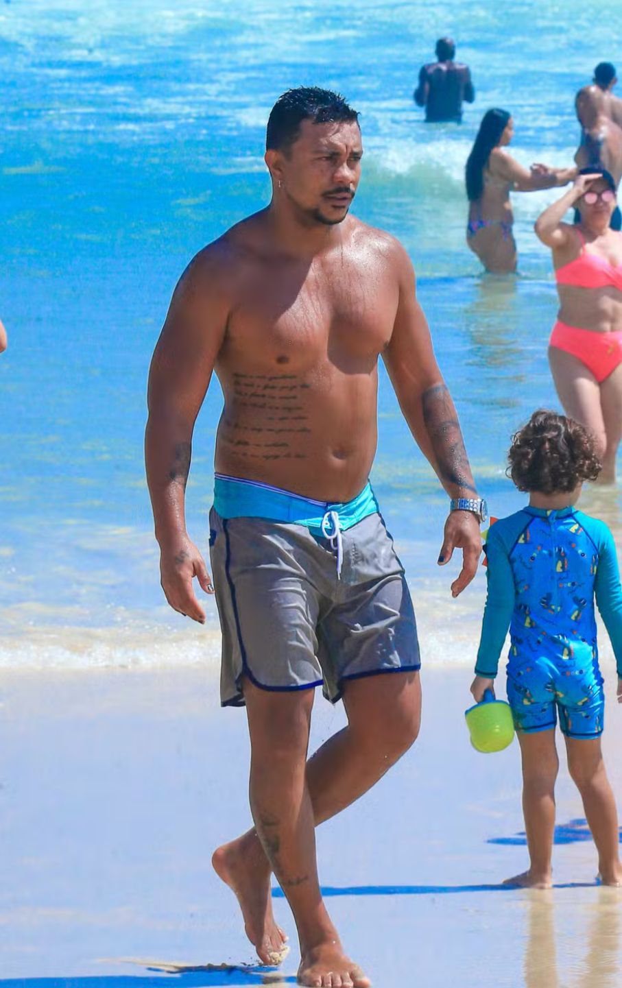 Xamã, de 36 anos, aproveitou o sábado (22) para relaxar na praia da Barra da Tijuca, no Rio de Janeiro. O cantor e ator, que interpreta Bagdá na novela Três Graças, da TV Globo, chamou atenção pela boa forma.
