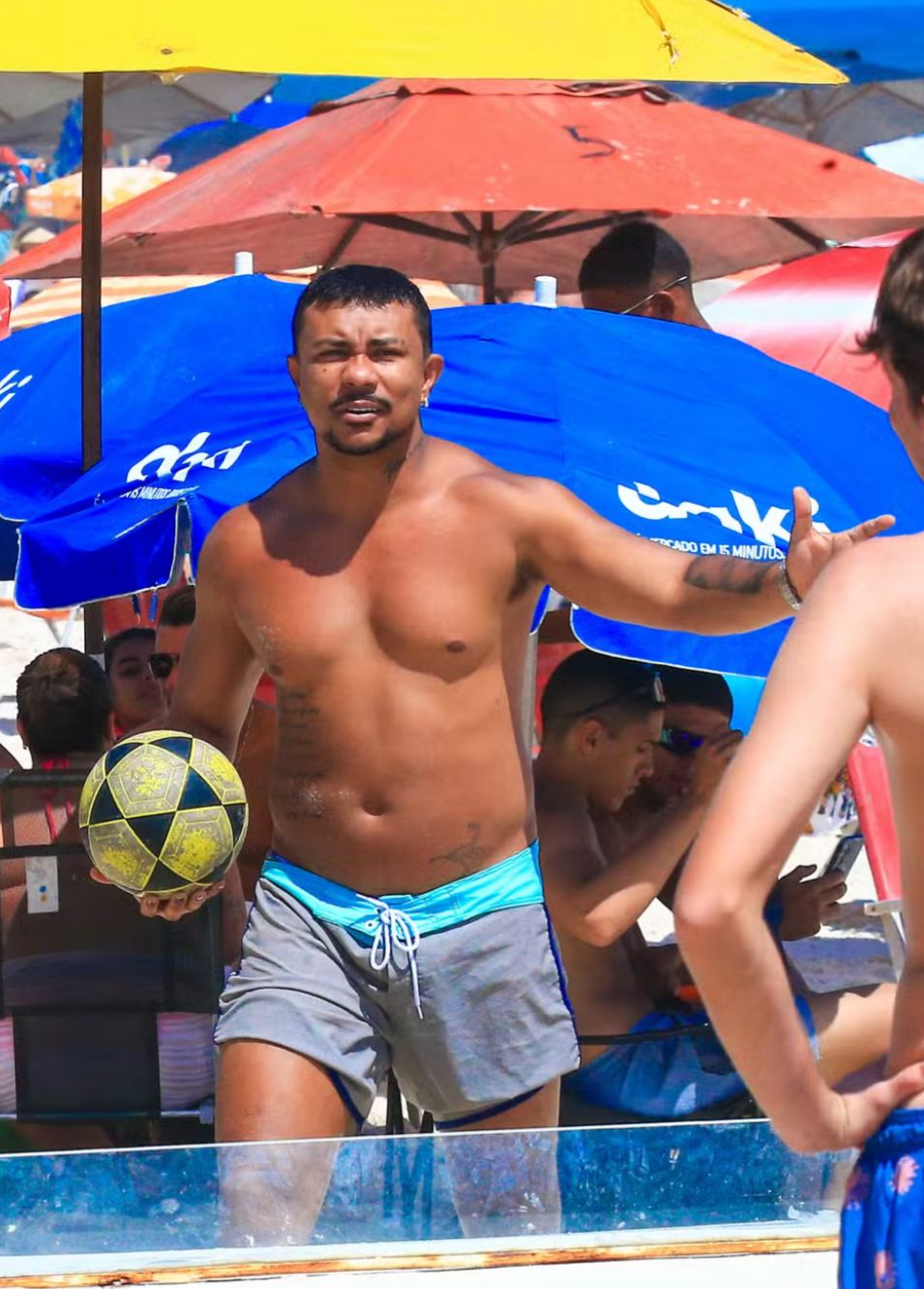 Xamã relaxa na praia da Barra da Tijuca, no Rio, exibindo boa forma e jogando futmesa